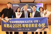 [경남도민뉴스=최인태 기자] 목포시가 한국여행업협회(KATA)가 선정한 ‘2025 KATA 특별공로상’을 수상했다. 한국여행업협회는 국내‧외 인바운드·아웃바운드 여행사 3,000여 개와 관광업계, 항공사 등 100여 개 유관기관이 참여하는 단체로, 문체부와 함께 국내외 관광 활성화와 관광산업 발전을 위한 다양한 사업을 추진하고 있다. 협회는 지난 11월 21일 서울 롯데호텔에서 열린 2025 KATA 정기총회에서 전국 지자체 중 유일하게 목포시에 특별공로상을 수여했다. 이번 수상은 대한민국 관광거점도시인 목포시가 문체부 및 KATA와 함께 지난 6월 ‘제38차 한·대만 관광교류회의’를 성공적으로 개최하고, 국내·외 관광객 유치를 위한 다양한 세일즈마케팅에 적극 협력한 공로를 높이 평가한 결과다. 전국 3,000여 여행업계 대표들의 감사와 지지로 신설된 상이라는 점에서 의미가 더욱 크다. 지난해 ‘대한민국 여행하기 가장 좋은 도시’, ‘2025 미식관광도시’ 등 대표 브랜드 대상을 수상한 목포시는 올해 국제남도미식산업박람회 등 주요 국제행사를 통해 글로벌 관광거점도시로서의 경쟁력을 강화해