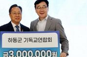 [경남도민뉴스=김태수 기자] 하동군은 지난 8일 군청 대회의실에서 개최된 기독교연합회 조찬 기도회에서, 연합회원들이 군정 발전을 기원하며 고향사랑기부금 3백만 원을 전달했다고 밝혔다. 특히, 기독교연합회는 답례품으로 사랑의 목욕(효도) 쿠폰을 선택해 90만 원 상당의 쿠폰이 지역 어르신들에게 다시 기부될 예정이다. 이날 대표로 고향사랑기부금을 전달한 최은장 목사는 “기도로 시작한 자리가 실질적인 사랑의 실천으로 이어지기를 기원하며 고향사랑기부에 참여했다. 이번 기부가 지역사회에 나눔 문화를 전하고 선한 영향력을 퍼트리는 계기가 되기를 바란다”라고 전했다. 이에 하승철 하동군수는 “종교적 공동체가 지역과 함께 호흡하고 있다는 연대감을 보여주어 감사하다. 소중한 기부금은 사회적 약자나 어려운 이웃을 위해 사용하고, 실질적인 자원을 제공하도록 노력하겠다”라고 화답했다. 한편, 고향사랑기부제는 주소지를 제외한 원하는 지방자치단체에 연간 최대 2천만 원까지 기부할 수 있는 제도다. 하동군은 새롭게 건립되는 보건의료원의 응급·재활 장비 구입을 지원하는 지정 기부 ‘행복하자 아프지 말
