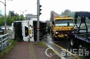 오늘(4월 27일) 14시 30분경 진주시 유곡동 입구 구 북부파출소 뒤편에서 트럭이 전도되는 사고가 발생했다. 현장에서 사고 수습중이던 경찰에 의하면 "거의 직각코스에서 좌회전하던 차량이 빗길에 과속도때문에 전도된것같다"며 "다행히 운전자는 무사하다"고 밝혔다.