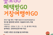 [경남도민뉴스=백형찬 기자] 거창군은 축제와 꽃구경으로 풍성한 가을을 맞아 생활인구 증진 및 가을 축제 활성화를 위해 여행비를 지원하는 3GO(꽃보GO, 혜택받GO, 거창여행하GO!) 이벤트를 진행한다. 3GO 이벤트는 9월 23일에서 11월 10일 사이에 거창 추천 가을 축제와 여행지 1곳 이상을 방문한 관외 주민 대상을 대상으로 진행하며 개인 SNS에 거창 관광 홍보 콘텐츠를 남기면 숙박비/식음료비를 각각 5만 원 한도 내에서 지원하는 사업이다. 본 이벤트에 참여하는 방법은 추천 가을 축제·여행지 중 1곳 이상 방문하기 가을은 축제로 풍성한 계절로 한마당대축제(9.26.~9.29.), 꽃&별여행(9.13.~10.13.), 거창창포원 국화전시(10월 중 예정), 거창사건추모공원 국화관람회(10월 중 예정) 등 각양각색의 다양한 축제들이 진행된다. 또 추천 가을 여행지로는 대표 관광지 8곳(거창창포원, 거창항노화힐링랜드, 거창수승대, 거창별바람언덕, 가조온천관광지, 월성계곡군립공원, 금원산자연휴양림, 거창사건추모공원)과 의동마을 은행나무길이 있다. 특히 거창 별바람언덕의 아스타 국화와 가조온천꽃단지의 황화코스모스가 만개했으니 서둘러 방문해 보길 바란다