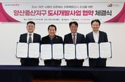 [경남도민뉴스=최미정 기자] 양산시는 물금읍 증산리 일원의 ‘양산증산지구 도시개발사업’ 추진을 위해 11일 제일건설컨소시엄의 대표사 ㈜제일건설, 웰메이드플레이스㈜, 한국투자증권㈜과 사업 협약을 체결했다고 밝혔다. 이번 협약 체결은 지난해부터 세 차례에 걸쳐 추진해 온 민간참여자 공모 결과 제일건설컨소시엄이 지난해 9월말 우선협상대상자로 선정된 이후, 약 4개월간 양산시와 제일건설컨소시엄간의 협상과 경남도의 협약 승인 절차를 마무리한 뒤 진행된 것으로 이번 협약을 통해 양산시의 핵심 도시개발 사업 중 하나인 증산신도시 조성이 본격적인 추진될 것으로 전망된다. 양산 증산지구 도시개발사업은 물금읍 증산리 일원 약 80만㎡ 부지에 공동주택 및 단독주택 7,069세대를 포함한 주거단지와 공원·녹지, 교육·문화 시설을 조성하는 대규모 도시개발사업이다. 총사업비는 약 8,331억원 규모로 양산시가 50.1%, 제일건설컨소시엄 49.9% 출자한 특수목적법인을 설립해 사업을 추진할 계획이다. 특히 이번 도시개발사업은 2040년 양산시 계획인구 48만 명 달성과 미래 성장 거점 교두보로서의 역할을 할 것으로 기대되며