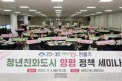 [경남도민뉴스=김동규 기자] 양평군은 지난 4일 오후 3시 양평군청 대회의실에서 ‘청년친화도시 조성을 위한 미래 방향성과 차별화 전략’을 주제로 ‘23-30 매력 양평 만들기’ 정책세미나를 개최했다. 이번 세미나는 청년이 머물고 싶은 도시, 청년이 주도적으로 참여할 수 있는 ‘매력양평’ 구현을 위한 실질적인 정책 방향을 논의하고자 마련됐다. 이날 행사에는 전진선 양평군수를 비롯해 양평군의회, 양평군 정책자문단, 청년정책위원회, 청년단체 등 관계자 100여 명이 참석했다. 1부에서는 인사말씀과 축사, 기념촬영이 진행됐으며, 2부에서는 손신 교수(아신대학교, 양평군 정책자문단 위원)의 ‘청년친화도시 조성을 위한 미래 방향성 및 차별화 전략’과 길청순 이사장(지역농업네트워크 서울경기제주협동조합, 양평군 정책자문단 위원)의 ‘농업·농촌의 미래와 청년농업인’ 발제가 이어졌다. 전진선 양평군수는 “청년이 머물고 싶은 도시, 청년이 주도적으로 참여할 수 있는 ‘매력양평’을 만들기 위해 행정과 지역사회가 함께 힘을 모아야 한다”며 “오늘 세미나에서 제시된 다양한 의견을 향후 청년정책에 적극 반영하겠다”고 밝혔다.