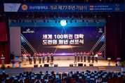 [경남도민뉴스=구인애 기자] 경상국립대학교는 10월 20일 오전 10시 가좌캠퍼스 GNU컨벤션센터 2층 대강당에서 개교 77주년 기념식을 개최했다. 개교기념식은 개식, 국민의례, 대학 연혁 보고, 개척시 낭송, 총장 기념사, 축사, 시상식, 비전 선포식, 교가 제창, 기념 촬영 등의 순으로 진행했다. 개교기념식 행사는 경상국립대학교 유튜브 채널을 통해 실시간 송출했다. 경상국립대학교는 기념식에서 각종 시상식[개척명예장, 총장 특별상, 개척한림원 표창, 7인의 영리서처(Young Researcher) 현판 수여, 장기근속상]을 마련하여 대학 발전에 기여한 교내·외 인사와 우수 연구자들의 공로를 기렸다. ▲개척명예장은 ㈜영남소방엔지니어링 류상수 대표에게 수여했다. 류상수 대표는 경상국립대학교 농업기계공학과를 졸업(1982년)했으며, 삼성공조(주), 안전보건공단 등을 거쳐 1996년에 ㈜영남소방엔지니어링에 입사 후 2005년 대표이사로 취임했다. 3월 14일 대학발전기금 1억 원을 출연하며 “나눔을 받아야 하는 대상은 많지만 모교 후배들의 장학을 위한 발전기금으로 기부하는 것이 무엇보다도 가치 있는 일이고, 그들로 하여금 또 다른 사회봉사가 이루어질 수 있다고 생