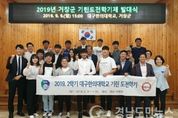 (경남도민뉴스) = 거창군은 지난 9일 대구한의대학교 기린도전학기제 발대식을 개최했다. 대구한의대학교 학생 5명이 주역이 되어 스스로의 진로에 대해 고민하고 농업의 미래를 발견하게 될 이번 기린도전학기제에는 대구한의대학교 안창근 교수, 이준선, 김태수 보조교수, 거창한 파머스가 진행한다. 거창군에서 진행되는 대구한의대학교 기린도전학기제는 9월 9일부터 11월 15일까지 진행된다. ‘기린도전학기제’란 대구한의대학교에서 운영하며, 스스로 나만의 과제를 설계하고 학교 내외에서 그 활동을 수행함으로써 학점을 인정받는 제도를 말한다. 이 프로그램을 통해 학생들은 현장에서 개인의 역량과 진로에 대해 고민할 수 있는 시간을 갖게 된다. 특히 올해 거창군에서 진행되는 ‘기린도전학기제’는 학교 밖에서 정규교과프로그램을 운영하고 이를 학점으로 인정해주는 전국최초 학기제 운영으로, 거창 농산물에 대한 판매 전략 수립‧유통 마케팅 등 실습 위주로 실행해 청년 취업과 창업에 실직적인 도움을 줄 수 있을 것으로 기대된다.