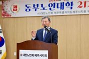 [경남도민뉴스=하형수 기자] 김완근 제주시장은 2월 11일 조천주민교류센터 회의실에서 열린 제21기 동부노인대학 졸업식에 참석해 축하 인사를 전했다. 이번 졸업식은 졸업생 32명과 내빈 등이 참석한 가운데 학사보고, 졸업증서 수여, 표창 수여, 축사 등의 순서로 진행됐다. 제주시 동부노인대학은 2년 과정의 교육프로그램으로, 어르신들의 삶의 질을 높이고 건강한 노후 생활을 지원하기 위해 운영되고 있다. 프로그램은 매주 화요일과 수요일 2시간씩 진행되며, 노인 교양, 건강관리, 정치·사회·시사 상식, 문화 체험 활동 등 다양한 내용으로 구성돼 있다. 김완근 제주시장은 “노인대학을 졸업하신 여러분께 진심으로 축하의 말씀을 드리고, 나이를 뛰어넘는 여러분의 열정과 도전은 우리 모두에게 큰 울림을 주고 있다”며, “병오년 새해 배움의 기쁨이 여러분의 삶의 버팀목이자 활력이 되어 언제나 건강하고 행복한 나날을 이어가시길 바란다”고 말했다.