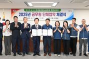 [경남도민뉴스=권중환 기자] 진주시와 전국공무원노동조합 진주시지부는 13일 시청 5층 상황실에서 단체교섭을 마무리하고 ‘2025년 단체협약 체결식’을 가졌다. 이번 단체협약은 지난 5월 13일 노조 측의 단체교섭 요구서 제출을 시작으로, 6월 12일 상견례를 거쳐 부서별 실무회의와 실무교섭을 진행한 끝에 최종 합의에 이르렀다. 주요 합의사항은 ▲공무원 근무시간 면제제도(타임오프제) 도입 ▲당직제도 개선(동지역 재택당직 폐지 시범운영 및 당직사령 재택근무 전환) ▲장기 재직휴가 확대 및 새내기 도약휴가 신설 ▲맞춤형 복지비 인상 등으로 근무 여건 개선과 복지 향상에 중점을 두고 있다. 이번 단체협약은 양측 대표의 서명으로 확정됐으며, 향후 2년간 효력을 갖게 된다. 김영태 지부장은 “노사 양측이 상호 존중과 신뢰를 바탕으로 충분히 논의한 끝에 조합원의 권익과 복지를 한 단계 끌어올리는 합의를 이끌어냈다”며 “이번 성과가 건강하고 활력 있는 공직문화를 정착시키는 계기가 되기를 기대한다”고 말했다. 조규일 진주시장은 “이번 합의는 직원들이 자부심과 열정을 가지고 일할 수 있는 든든한 토대를