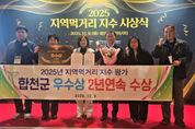 [경남도민뉴스=김춘호 기자] 합천군은 농림축산식품부와 한국농수산식품유통공사(aT)가 주관한 2025년 지역먹거리 지수 평가에서 한국농수산식품유통공사 사장상(우수상)을 받으며, 2년 연속 우수 지자체로 선정됐다고 10일 밝혔다. 합천군은 경남도 내 군 단위에서 유일한 연속 수상에 성공하며, 합천군의 먹거리 정책 추진이 전국적으로도 높은 평가를 받고 있음을 다시 한번 입증했다. 합천군은 지역 생산·유통·소비의 연계를 강화하는 과정에서 학교급식에 지역 로컬푸드를 안정적으로 공급해 학생들에게 신선하고 안전한 식재료를 제공한 점이 우수한 성과로 인정받았다. 또한 지자체장의 정책 추진 의지, 다품목 생산체계 구축 지원, 농가 조직화 교육 등 핵심 지표에서 우수한 점수를 받아 올해 평가에서도 우수상을 이어갔다. 시상식은 12월 9일(화) 대전 인터시티호텔에서 전국 지자체 관계자 등 120여 명이 참석한 가운데 열렸다. 현장에서는 농림축산식품부 장관상과 aT 사장상이 순차적으로 수여됐으며, 지자체별 정책 성과를 담은 소감 영상이 상영되어 큰 호응을 얻었다. 군 관계자는 “이번 수상은 합천의 농업과 농촌이 한 단계